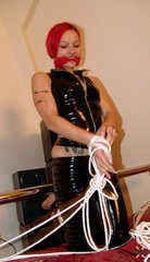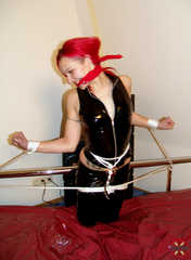 The second Bed-Bondage for the cute red devil. - TKBaby cuts a fine figure in your job as a new Bound-Girl. - After the bondage, it begins with a white cleavegag, which of course matches the color of the ropes and your outfit wonderfully. - A little fight started, but it wasn't enough to free it. - In the further part of the shoot we gave her some freedom and were able to put on a red Bandana-Cleave again. - That was the crowning end of the day. - And somehow our TKBaby was able to free himself from the shackles and "tell" your opinion.