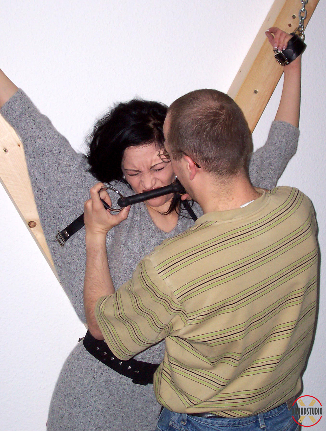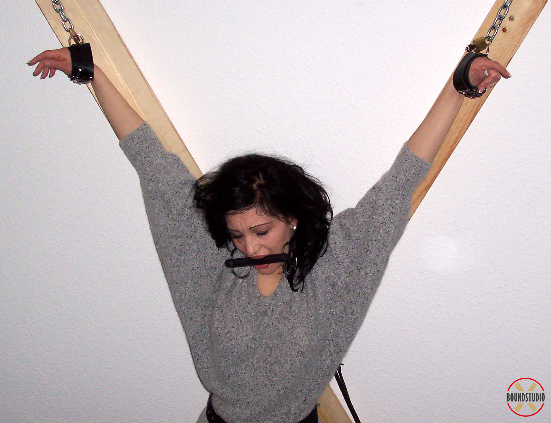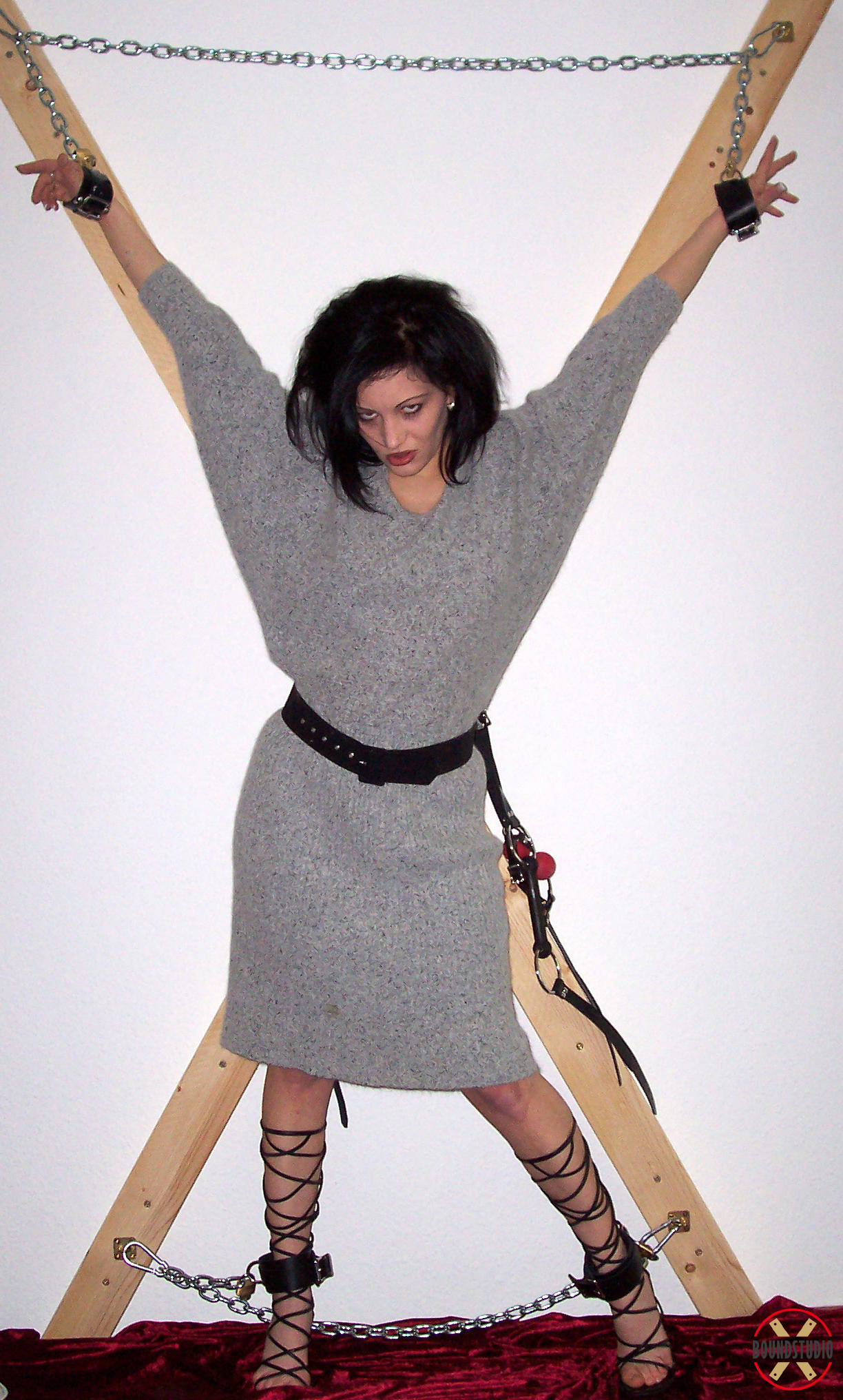 LiLu wakes up after her nightmare on the cross in the basement of the Boundstudio. - Of course there is no interest on the part of the Boundmaster to simply leave his captive behind, let alone that she can call for help. - A small black bitgag will help. - It is quickly sunk between your lips, so LiLu can now silence and wriggle helplessly. - And the Boundmaster can once again expand his photo gallery in peace!
