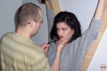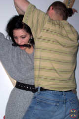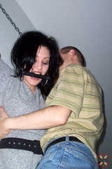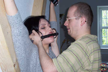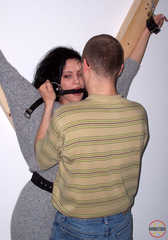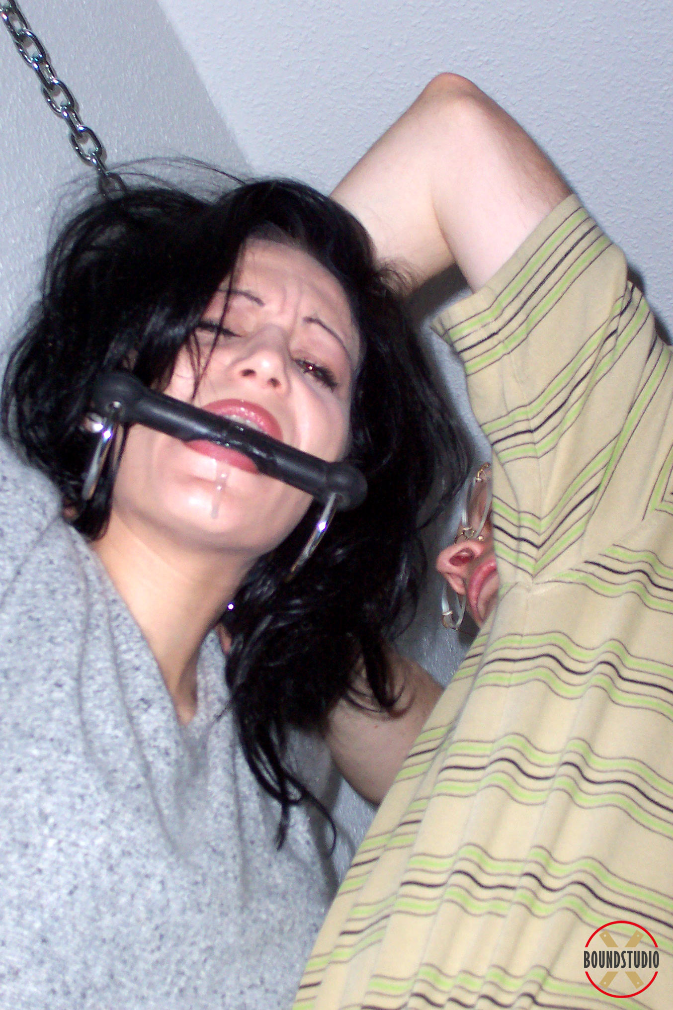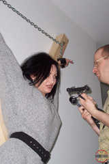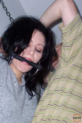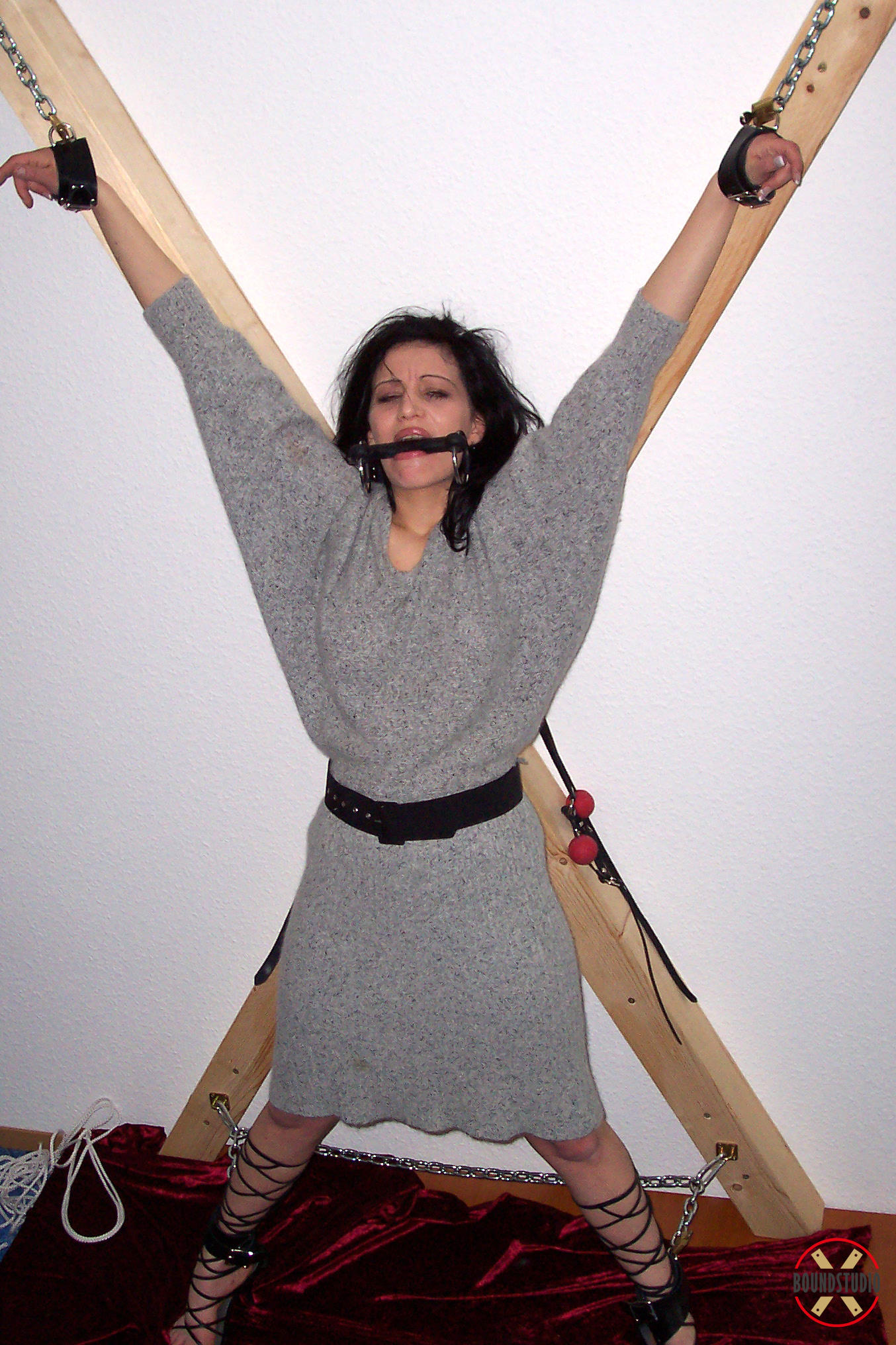 LiLu wakes up after her nightmare on the cross in the basement of the Boundstudio. - Of course there is no interest on the part of the Boundmaster to simply leave his captive behind, let alone that she can call for help. - A small black bitgag will help. - It is quickly sunk between your lips, so LiLu can now silence and wriggle helplessly. - And the Boundmaster can once again expand his photo gallery in peace!