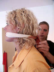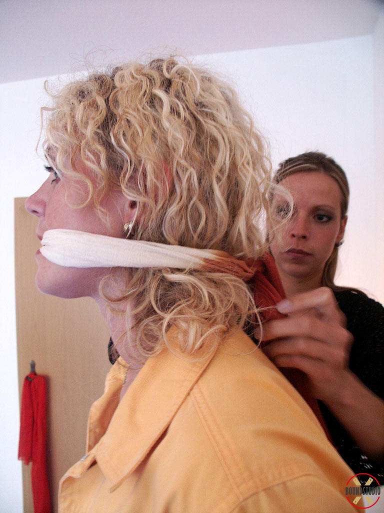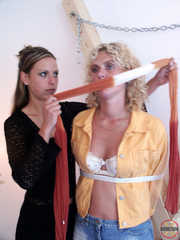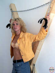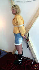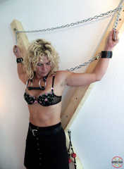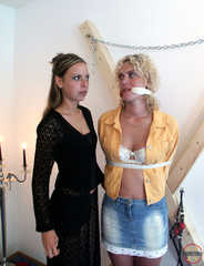 Our dominant Kathy had thought it all out nicely! - When Lea is back from riding, the shoot takes place properly here in the castle. In addition, she recently suffered a little from Lea. - Lea had just left her bound and gagged and that urges revenge! - Said and done! - Hardly back in the house Lea is ordered to the cross. Kathy puts on her chains and necessary accessories and Lea becomes a submissive Bound-Girl. - A cloth is also found quickly, so Kathy can calmly think about what she could do with your new captive. - In the second part there was a change of clothes and Lea posed with a few gags.