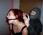 After a short fight she is overwhelmed and is brought to rest after a firm fixation with a white cleavegag. Ballgags and a bitgag follow little by little. -